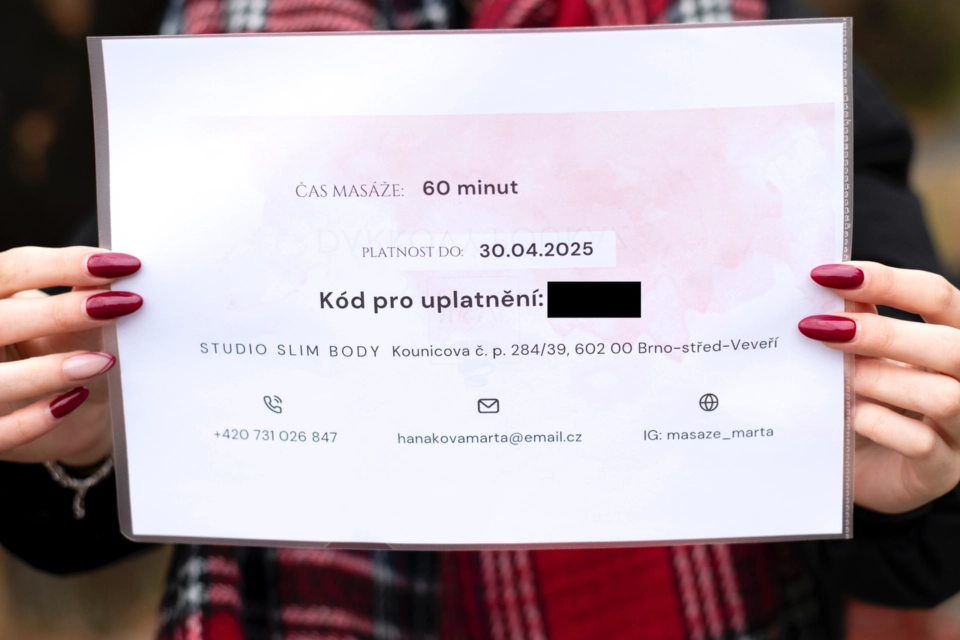 Dopřejte sobě nebo svým blízkým uvolňující masáž. V masážích Marta Vám pomohou vybrat masáž na míru přímo pro Vás💆♀️💆♂️. Délka masáže: 60 minut Adresa: Kounicova 284/39, Brno Platnost poukazu: 30.4.2025 Odkaz na webovou stránku: https://www.marta-masaze.cz/ Doprava: - možnost osobního předání 4.12. na Dobrotrhu od 10 do 16 hodin před budovou Q Mendelovy univerzity v Brně - přes zásilkovnu (poštovné 50 až 140 Kč) Jsme studenti Mendelovy univerzity a představujeme vám aukci, jejímž cílem je podpořit ty, kteří to nejvíce potřebují. Tento rok bychom rádi pomohli: - Melisce, dvouleté holčičce, která bojuje s neurologickými problémy - Pětileté Ariance, která se potýká s vážnými genetickými poruchami - Útulku Čtyřlístek pro hafany snažící se obnovit svůj domov pro opuštěné psy po ničivých povodních Výtěžek z Dobrotrhu půjde rovným dílem pro tyto podporované subjekty. Více informací naleznete na facebookových stránkách Dobrotrhu: https://www.facebook.com/dobrotrhmendelu/?locale=cs_CZ