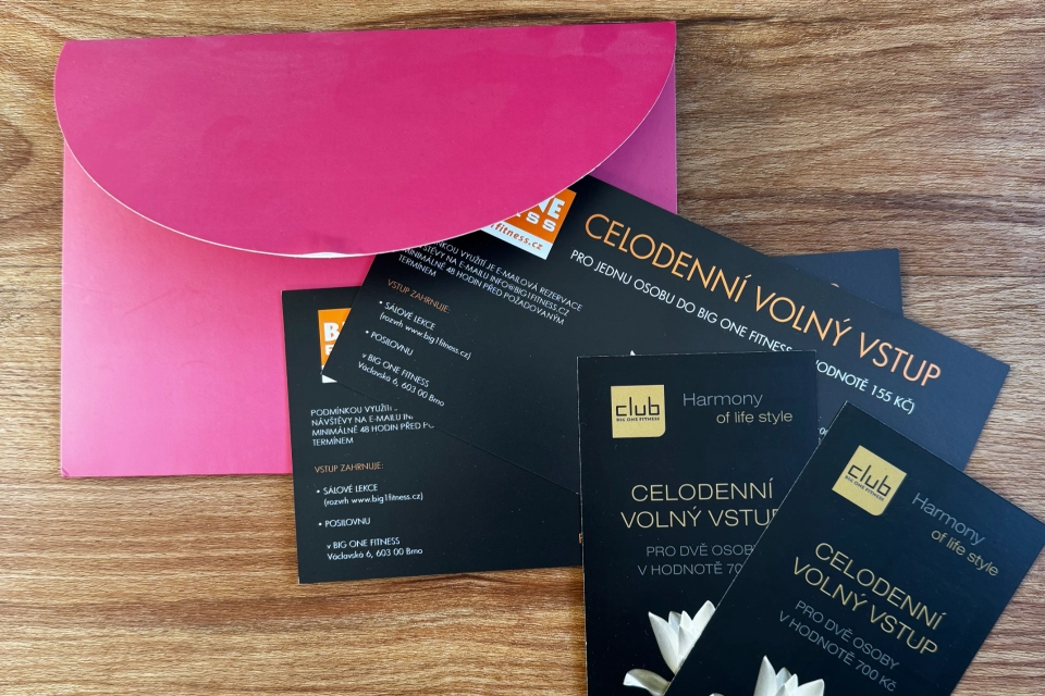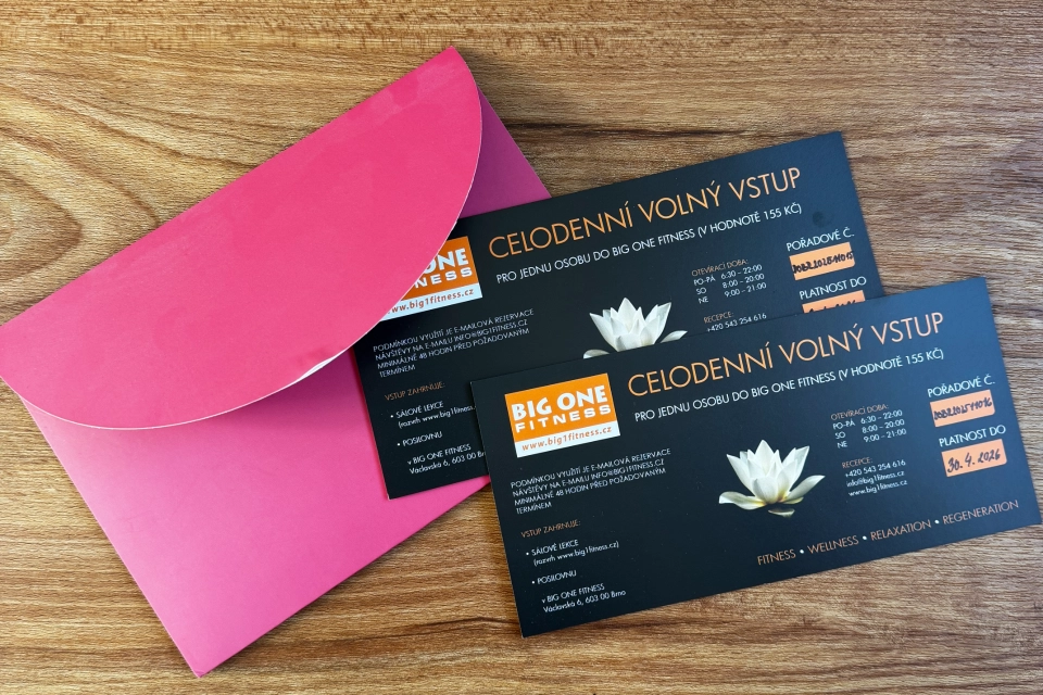 Volné vstupy do moderního fitness centra BIG ONE FITNESS v Brně. Každý poukaz umožňuje užít si celý den ve fitness, wellness zóně a na skupinových lekcích, a to bez jakýchkoli dalších poplatků. Stačí si jen vstup telefonicky rezervovat a užít si svůj den plný pohybu i odpočinku. Co vstup zahrnuje: - Neomezený celodenní vstup do fitness - Skupinové lekce (dle rozpisu) - Wellness a relaxační zázemí - Možnost využít ve všední dny i o víkendu - Příjemné, moderní prostředí v centru Brna V nabídce jsou poukazy pro jednu osobu i vstupenky pro dvě osoby. Hodnoty poukazů jsou uvedeny přímo na kartách (155–700 Kč). Platnost všech vstupů je do 30. 4. 2026. Poukazy jsou v perfektním stavu, nepoužité – ideální jako dárek, motivace ke cvičení nebo příjemný wellness den pro sebe či blízké. Způsob doručení a Osobní odběr Osobní odběr (ZDARMA): Osobní odběr zakoupených předmětů bude možný 3. 12. 2025 v čase 10:00–16:00 v rámci akce Dobrotrh MENDELU na Mendelově univerzitě (před budovou Q). Prosíme, dodržte uvedený čas pro vyzvednutí. Doručení Zásilkovnou (Zpoplatněno): V případě doručení prostřednictvím Zásilkovny je cena zaslání od 89 Kč na doručení na výdejní místo a od 129 Kč na doručení na adresu. Komu v aukci a na Dobrotrhu 2025 pomůžeme Vaše štědrost a podpora v rámci Dobrotrhu MENDELU 2025 putuje k následujícím potřebným organizacím a jednotlivcům: Podpora organizací Slezská diakonie Brno: Organizace poskytující sociální a zdravotní služby pro lidi v náročných životních situacích. Autistická škola Brno: Specializované vzdělávací zařízení, které zajišťuje péči a rozvoj dětí a mladistvých s poruchou autistického spektra. Dětské centrum Chovánek: Poskytuje komplexní péči a domov dětem, které nemohou vyrůstat ve své biologické rodině. Naděje pro ježky: Organizace pečující o zraněné, opuštěné a týrané ježky s cílem vrátit je zpět do volné přírody. Podpora jednotlivců Amélie Mihálková: Příspěvek bude použit na úhradu výdajů spojených s její náročnou a dlouhodobou léčbou. David Stojkovič: Příspěvek bude určen na úhradu výdajů spojených s nezbytnou péčí a rehabilitací. O spolku Séva, z.s. Spolek Séva, z.s. je klíčovým spoluorganizátorem Dobrotrhu MENDELU. Jeho hlavním cílem je podpora zdravotně a sociálně znevýhodněných osob, neziskových organizací a společensky prospěšných projektů.