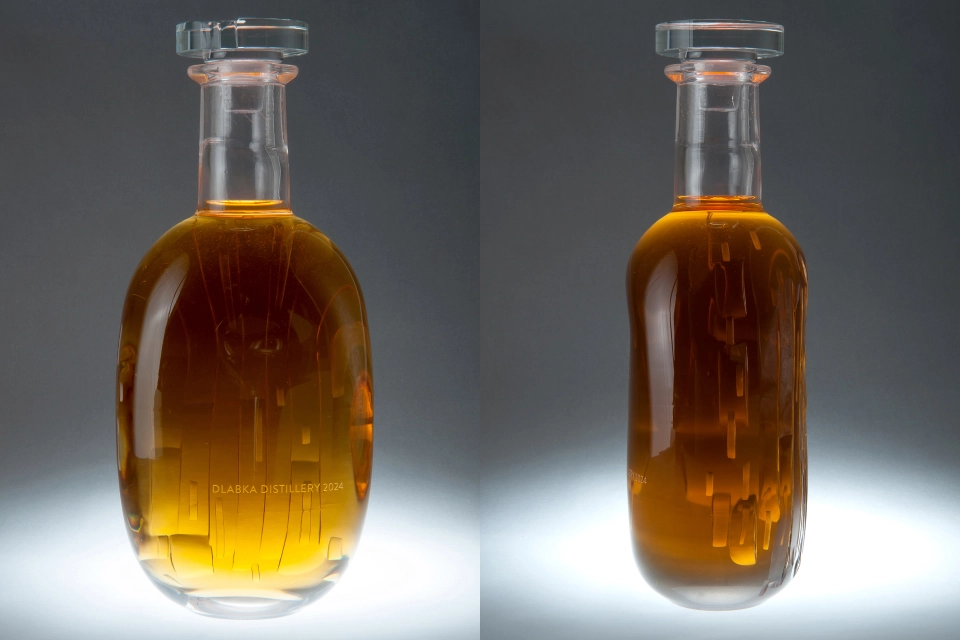 Jedna z dvanácti autorských lahví z ručně foukaného českého skla naplněná limitovanou WHISKY od české palírny Dlabka Distillery. Lahev je vyrobena dle návrhu skláře a uměleckého rytce Jaroslava Šáry ve sklárně Kolektiv Ateliers v Novém Boru. Je zdobena technikou fazetového řezu, který na zadní straně tvoří jemný liniový vzor. Je uzavřena elegantní skleněnou zátkou Vinolok ze sklárny Preciosa a uložena v luxusní dřevěné krabičce. Obsahem lahve je Dlabka Whisky Unpeated Apricot Brandy Cask - jednosladová nenakouřená whisky z kvalitního českého ječmene, která část zrání ležela v sudu po Dlabka meruňkovici, díky čemuž dosáhl master blender Matěj Houdek krásně jemné smetanové struktury s tóny vanilky a sušeného ovoce. Součástí je záruka znovunaplnění lahve a to až dvakrát během roku 2025, pokud právoplatný majitel přijede s prázdnou lahví osobně přímo do palírny Dlabka Distillery ve Svijanském Újezdu. Patronem lahve je koktejlový bar Bylo, nebylo Jsme filmem inspirovaný koktejlový bar v Liberci a zaměřujeme se na vyprávění příběhů skrze naše koktejly. Patronství v rámci spolupráce s Dlabka Distillery nám umožnila se zapojit i do příběhů ostatních. Peníze z výtěžku jsme se rozhodli věnovat Centru Paraple, které se snaží pomoci tam, kde je třeba a tvořit tak smutné příběhy o něco šťastnější.