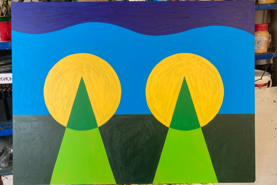 Akryl na sololitu 60 x 70 cm 2023 Když Dominiku Jirsovi před lety ateliér doporučil jeho psycholog, přišel se podívat spíš jen ze zdvořilosti. Svobodné tvůrčí prostředí ho však nadchlo a začal docházet pravidelně. Většinou maluje akrylem na sololit a předem velmi důkladně promýšlí barevné kompozice. Výsledkem jsou abstraktní obrazy s různě rytmizovanými geometrickými tvary nebo skvrnami, které ale mají své ukotvení v realitě. Sám Dominik říká, že maluje "takovou typickou českou krajinu". Ve tvarech, které umisťuje do vertikálních nebo horizontálních polí tak lze spatřovat jakési monumenty, menhiry nebo figurální obelisky. Nedá se to však říci s jistotou, inspirace možná pochází i z tvaru kaluže, kamene u cesty nebo snad odněkud uplně jinud. Dominik je fascinován jednoduchostí a krásou tvarů, věnuje se jim ve své tvorbě i mimo ateliér, tvoří grafiku a dalším jeho oblíbeným způsobem vyjádření je fotografie.