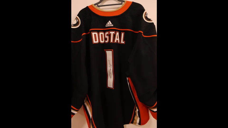 Lukáš Dostál – podepsaný originální dres gólmana Anaheim Ducks (NHL). Tato aukce je součástí #aukceroku, kterou pořádá Těhotnej kuchař. V ní se draží podepsané sportovní relikvie a veškerý výtěžek jde na zajištění provozu Dětského centra Milovice a Nadace Via.