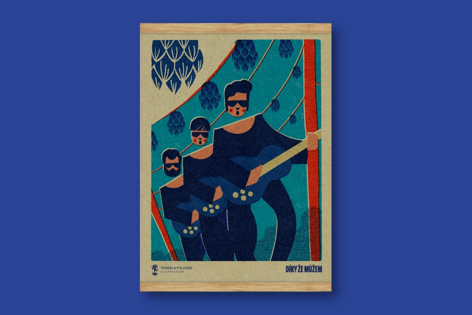 Fine art tisk 50x70 cm Na motivy písně Milenci v texaskách Tomski & Polanski pro knihu Písničkou ke svobodě Připojte se k jedinečné aukci ilustrací z nové knihy Písničkou ke svobodě od spolku Díky, že můžem, která vzniká k příležitosti 35. výročí sametové revoluce. Tento naučný zpěvník a jeho ilustrace představují hudbu v kontextu doby, kdy nebylo každému do zpěvu. Připojením se do aukce přispějete na podporu organizace Díky, že můžem a rozvoj našich aktivit na podporu svobody a demokracie. Aktivity spolku najdete na stránkách www.dikyzemuzem.cz. Výběr tvoří symbolicky sedmnáct písní, které udávaly tón své doby napříč žánrovým i ideovým spektrem. Jde o letmý průřez hudební tvrobou od šedesátých let po sametovou revoluci zabalený v příběhu, jak se šlo s písničkou ke svobodě. Písnička Milenci v texaskách je z muzikálu Starci na chmelu, který ukazuje idylku socialistické mládeže zalitou letním sluncem. Kde jinde se zamilovat než na chmelové brigádě? Přijďte si prohlédnout dražené ilustrace do Kavárny Mlýnská na Kampě do 7. 10. 2024.