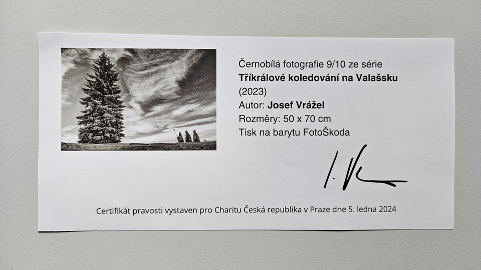Profil organizaceČernobílá fotografie vytištěná na barytu ve FotoŠkoda, adjustovaná pod sklem v tmavě hnědém dřevěném rámu (vnitřní rozměr 50 x 70 cm) a opatřená podpisem autora Josefa Vrážela. Fotografie je ze série Tříkrálové koledování na Valašsku a byla na přelomu prosince a ledna vystavena v Galerii Vinohradská 12 v rámci výstavy „My tři králové jdeme k vám…“ Fotograf Josef Vrážel věnoval do aukce celkem tři snímky, které zachycují mimořádné okamžiky z tříkrálové koledy v atraktivních kulisách rázovitého Valašska. Jejich prostřednictvím sleduje koledníky putující za každého počasí tímto nádherným krajem, aby přinesli požehnání do domů rozptýlených mezi kopci a údolími. Jeho fotografie jsou nejen záznamem, ale i poetickým vyjádřením spojení lidí, přírody a tradic, které jsou pro tento region tak charakteristické. Soubor fotografií vznikal ve spolupráci s Charitou Nový Hrozenkov a Vráželovi se v něm podařilo zachytit vizuální krásu i hluboký duchovní rozměr Tříkrálové sbírky. Tyto fotografie, plné dynamiky a autentičnosti, nenásilně podněcují divákovu fantazii a bezesporu dokážou proměnit doslova každý interiér v prostor s příběhem. Každý snímek je oknem do světa, kde se prolínají minulost a současnost, radost a sdílení, siluety koledníků a valašské krajiny. Tato aukce je výjimečnou příležitostí získat část tohoto magického světa a zároveň podpořit organizaci Tříkrálové sbírky, která každoročně pomáhá lidem v nouzi. Ukažte svou solidaritu a přispějete prostřednictvím umění na zajištění pomoci těm, kteří to potřebují.