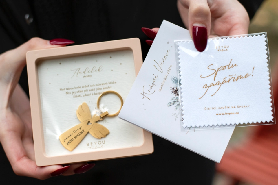 Obdarujte svoji oblíbenou osobu touto luxusní klíčenkou pro štěstí, zdraví a ochranu. 👼🪽 Materiál: pozlacená chirurgická ocel 18k zlatem Barva kovu: matná zlatá Rozměr anděla: 4,6x3,8cm Průměr kroužku: 2,5cm Součástí je čistící hadřík na šperky Doprava: - možnost osobního předání 4.12. na Dobrotrhu od 10 do 16 hodin před budovou Q Mendelovy univerzity v Brně - přes zásilkovnu (poštovné 50 až 140 Kč) Jsme studenti Mendelovy univerzity a představujeme vám aukci, jejímž cílem je podpořit ty, kteří to nejvíce potřebují. Tento rok bychom rádi pomohli: - Melisce, dvouleté holčičce, která bojuje s neurologickými problémy - Pětileté Ariance, která se potýká s vážnými genetickými poruchami - Útulku Čtyřlístek pro hafany snažící se obnovit svůj domov pro opuštěné psy po ničivých povodních Výtěžek z Dobrotrhu půjde rovným dílem pro tyto podporované subjekty. Více informací naleznete na facebookových stránkách Dobrotrhu: https://www.facebook.com/dobrotrhmendelu/?locale=cs_CZ