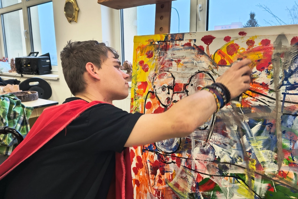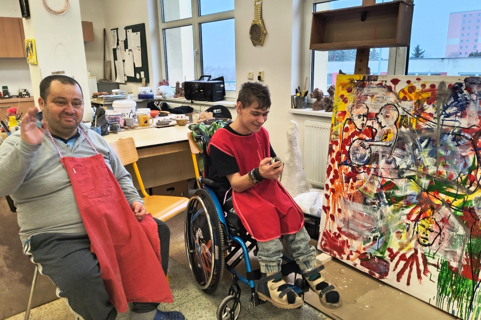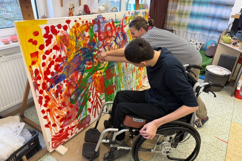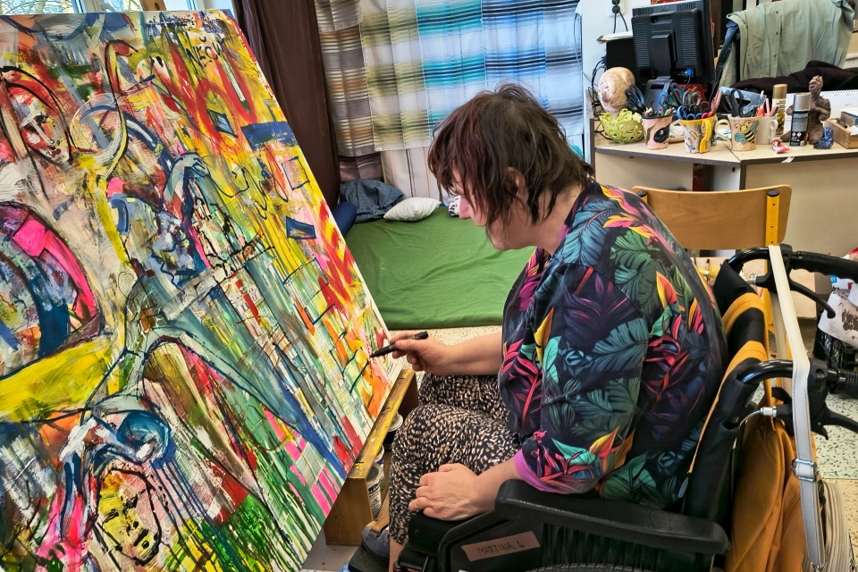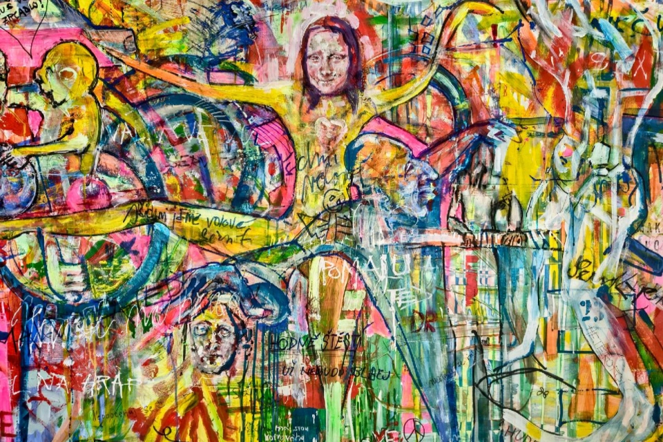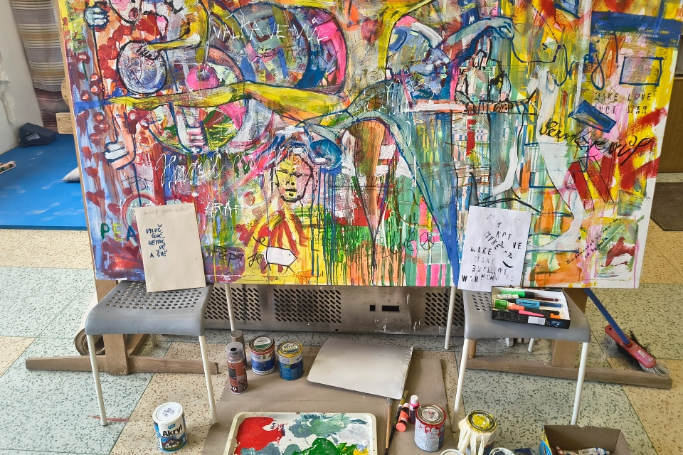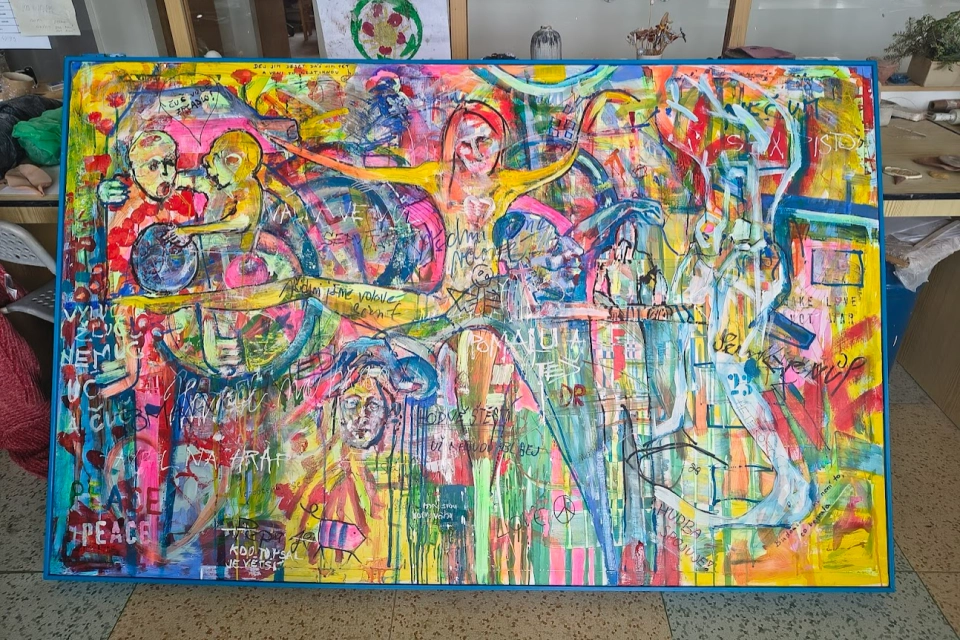 Profil organizaceRozměry: 200 cm × 120 cm Technika: kombinovaná – akryl, spreje, tuš na plátně Inspirace slavnou zdí Lennonova zeď na Malé Straně v Praze, která se desítky let proměňuje každým novým nápisem, malbou či vzkazem, byla přímou inspirací pro vznik obrazu Lennonova zeď 2025. Stejně jako originál zachycuje i tento obraz energii spontánního sdílení, radost z tvorby a propojení lidí různých zkušeností – vše prostřednictvím barev, tahů štětce a gest. Lennonova zeď 2025 – společné dílo Velkoformátový obraz Lennonova zeď 2025 vznikal během letošního roku přímo v ateliéru a keramické dílně Modrého klíče pod vedením výtvarnice Sylvy Tomkové. Více než padesát autorů – klientů, pracovníků, návštěvníků i přátel – přidávalo své tahy, barvy a okamžiky nálady. Základ vznikl v plenéru na zahradě a postupně se doplňoval spontánně, stejně jako graffiti na pražské Lennonově zdi. Dalo by se říci, že obraz funguje jako „seismograf“ naladění lidí v tomto roce a krajině. Zapojením se do online aukce tohoto obrazu podpoříte Modrý klíč; výtěžek přispěje k dalším aktivitám organizace a pomůže lidem s postižením, kteří potřebují oporu a možnost být součástí společného dění. TIP pro nákup: Obraz skvěle oživí prostorné interiéry – firemní lobby, kanceláře, kavárny, recepce i domácí rozlehlejší prostory nebo chodbu – a vnese do nich energii a živé barvy.