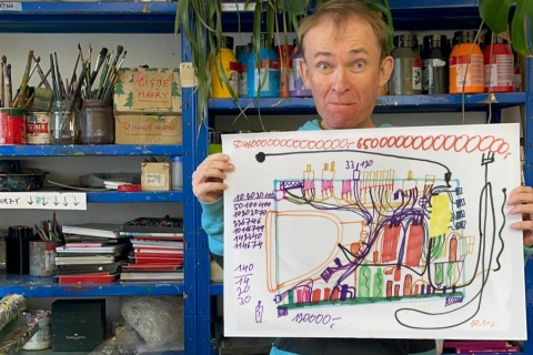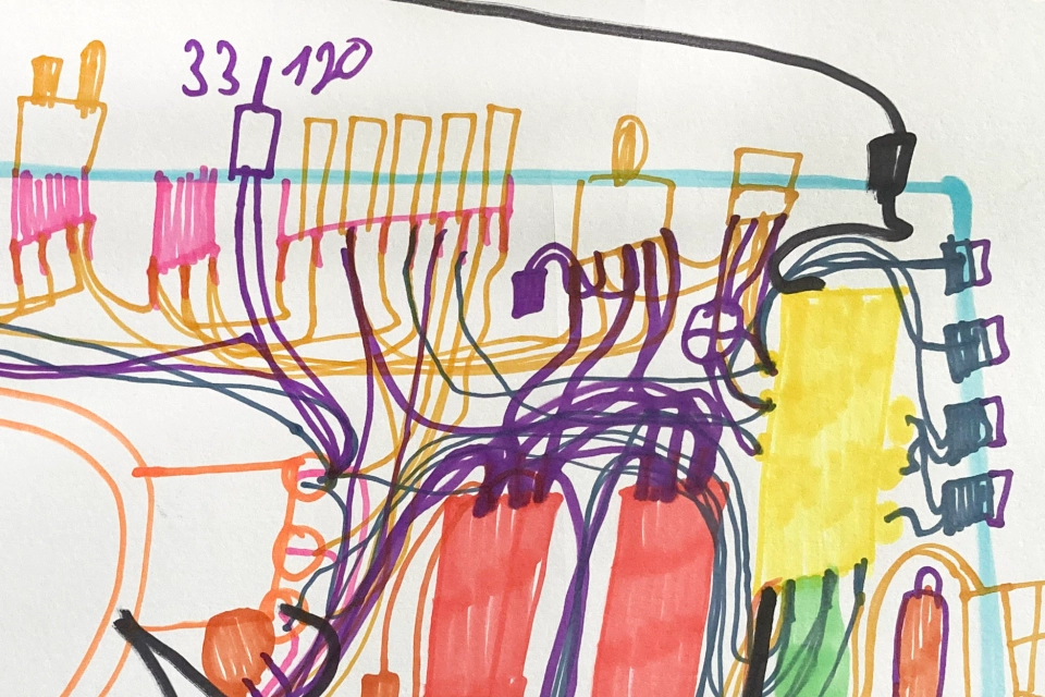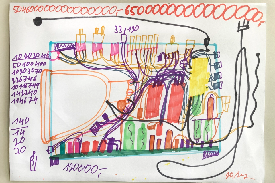 fix na papíře 42,5 x 60 cm 2024 Lukáš Paleček nadšeně sbírá a portrétuje staré vyřazené přístroje a spotřebiče, především pračky, rádia nebo magnetofony. Sbírá i jednotlivé součástky, ze kterých pak sestavuje svoje vlastní přístroje. Tímto nadšením v roce 2019 strhl i konceptuální umělkyni Evu Koťátkovou ke společné výstavě – performanci „Romo pračka pere okurky“ v pražské Galerii v Jelení. „Lukáš stroje pozoruje, poslouchá, napodobuje a učí se jejich řeč,“ postřehla autorka během jejich spolupráce. „Lidskou společnost představuje skrze technologický odpad, který produkuje.“ Kresby Lukáše Palečka se podobají rentgenovým snímkům a jsou nápadné zvláště propletenými liniemi drátů, kabelů, trubek nebo jiných sítí. Někdy se v nich objevuje i písmo nebo ceny, které stoupají do astronomických výšek. Palečkova tvořivost se ale nezastavuje u kreslení: zakládá si různé dokumenty do jakéhosi deníku, vytváří i pozoruhodné pantomimy s imaginárními pračkami a sekačkami. Navzdory poruše řeči se snaží neustále komunikovat se svým okolím a podat zprávu o svém světě. Lukáš měl výstavu "Zápisy a zákresy" v galerii Art Brut Praha (2022) byl součástí výstavy Myšlení obrazem v GHMP (2023).