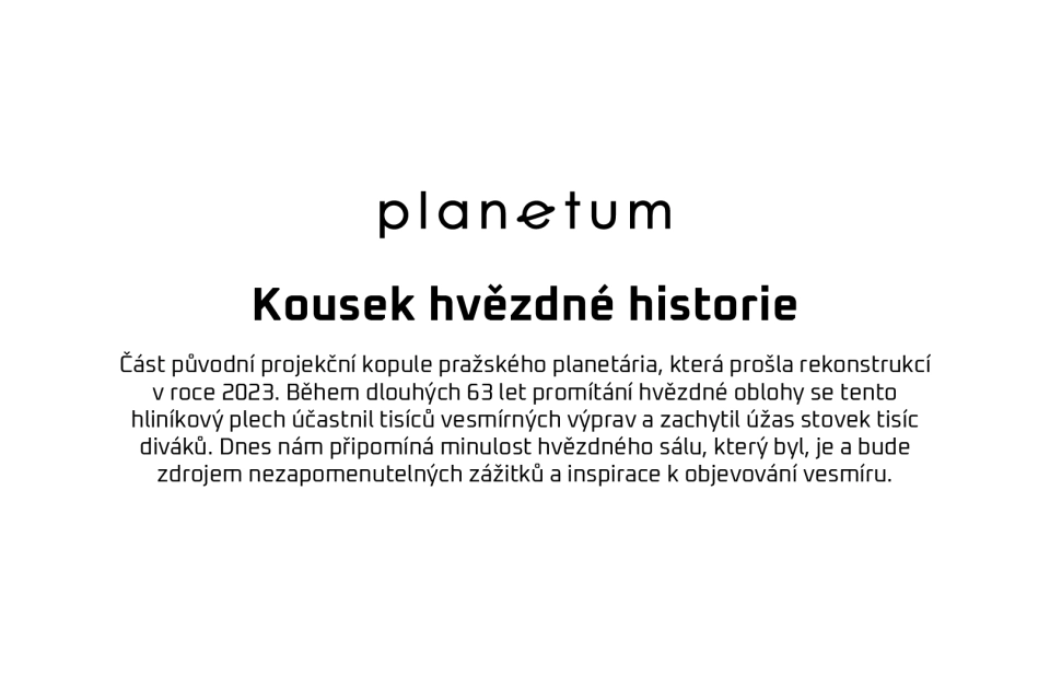 Jsou předměty, které mají hodnotu díky tomu, co jsou. A pak jsou ty, které ji získávají tím, čeho byly svědky. Tento hliníkový panel byl součástí původní kopule Planetária Praha, která po celých 63 let promítala hvězdnou oblohu na jedno z největších pláten. Projekční plocha byla jedinou částí planetárního sálu, která za celou historii neprošla změnou. Ať už se nad hlavami diváků vznášela souhvězdí antických bohů, nebo simulace přistání na Marsu, právě tenhle kus plechu byl tiše přítomen. Letos kopuli nahradila revoluční LED technologie s více než 45 miliony světelných bodů, která přinesla planetáriu světový věhlas. Ale několik starých panelů planetárium na památku zachovalo. Právě ten, který dražíme v této aukci, je jedním z posledních. Můžete jej zavěsit jako artefakt s příběhem, darovat jako věčnou inspiraci nebo si jej uchovat jako tichého svědka všech těch dětských “wau”, které se v sále po desetiletí ozývaly. A co je nejdůležitější – výnos z aukce poputuje malinké české hvězdárně v Jeseníku, která rozvíjí u dětí a mládeže to největší: zvědavost a chuť objevovat. Díky spolupráci největších planetárií v zemi ale může Jeseník dál zářit. Přihazujte na kus oblohy, který kdysi tvořil celý vesmír.