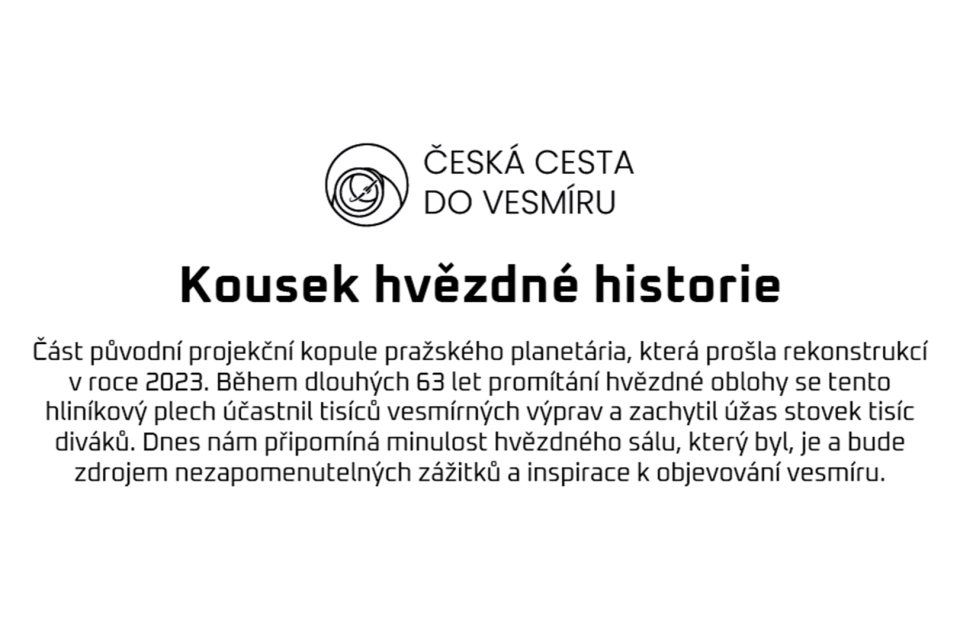 Jsou předměty, které mají hodnotu díky tomu, co jsou. A pak jsou ty, které ji získávají tím, čeho byly svědky. Tento hliníkový panel byl součástí původní kopule Planetária Praha, která po celých 63 let promítala hvězdnou oblohu na jedno z největších pláten. Projekční plocha byla jedinou částí planetárního sálu, která za celou historii neprošla změnou. Ať už se nad hlavami diváků vznášela souhvězdí antických bohů, nebo simulace přistání na Marsu, právě tenhle kus plechu byl tiše přítomen. Letos kopuli nahradila revoluční LED technologie s více než 45 miliony světelných bodů, která přinesla planetáriu světový věhlas. Ale několik starých panelů planetárium na památku zachovalo. Právě ten, který dražíme v této aukci, je jedním z posledních. Můžete jej zavěsit jako artefakt s příběhem, darovat jako věčnou inspiraci nebo si jej uchovat jako tichého svědka všech těch dětských “wau”, které se v sále po desetiletí ozývaly. A co je nejdůležitější – výnos z aukce poputuje malinké české hvězdárně v Jeseníku, která rozvíjí u dětí a mládeže to největší: zvědavost a chuť objevovat. Díky spolupráci největších planetárií v zemi ale může Jeseník dál zářit. Přihazujte na kus oblohy, který kdysi tvořil celý vesmír.
