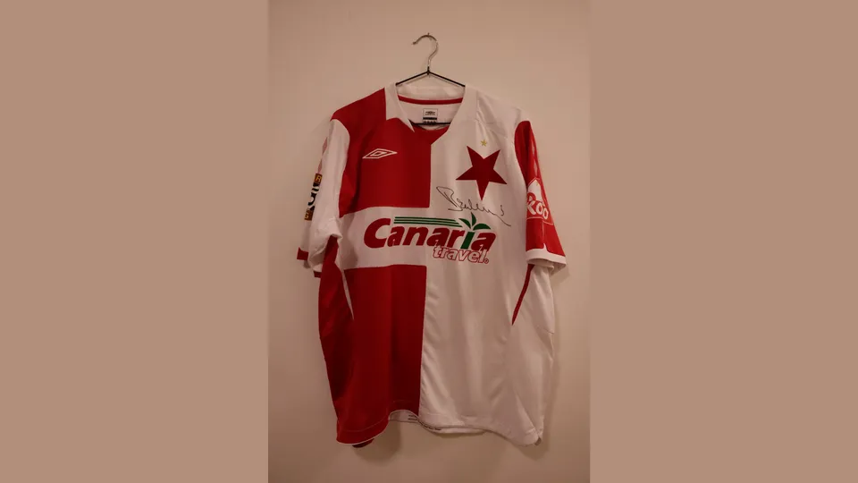 Erich Brabec - podepsaný slávistický dres Ericha Brabce z mistrovské sezóny 2008/2009. Tato aukce je součástí #aukceroku, kterou pořádá Těhotnej kuchař. V ní se draží podepsané sportovní relikvie a veškerý výtěžek jde na zajištění provozu Dětského centra Milovice a Nadace Via.
