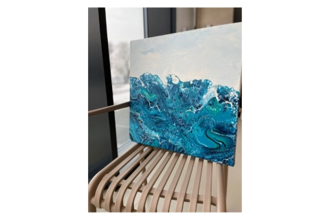Obraz Karoliny Ďatkové, 50 x 50 cm, technika: akrylový pouring. Zakoupením obrazu podpoříte děti se zrakovým postižením a jejich rodiny. Osobní předání je možné na Benefičním láskyplném podvečeru na Hukvaldech v pátek 6. 2. 2026, nebo po domluvě jinde v MS kraji, případně se domluvíme na zaslání.