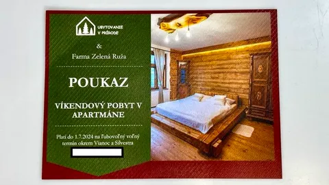 Poukaz na Farmu Zelená Ruža, víkendový pobyt v apartmánu v hodnotě 3 450 Kč. Tato aukce je součástí projektu DOBROTRH studentů Mendelovy univerzity v Brně. Výtěžek aukce pomůže zajištění provozu neziskové organizace Domov sv. Markéty, která mimo jiné pomáhá matkám s dětmi v nepříznivé životní situaci.