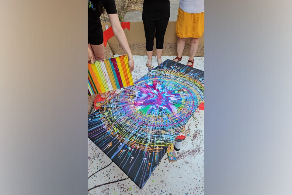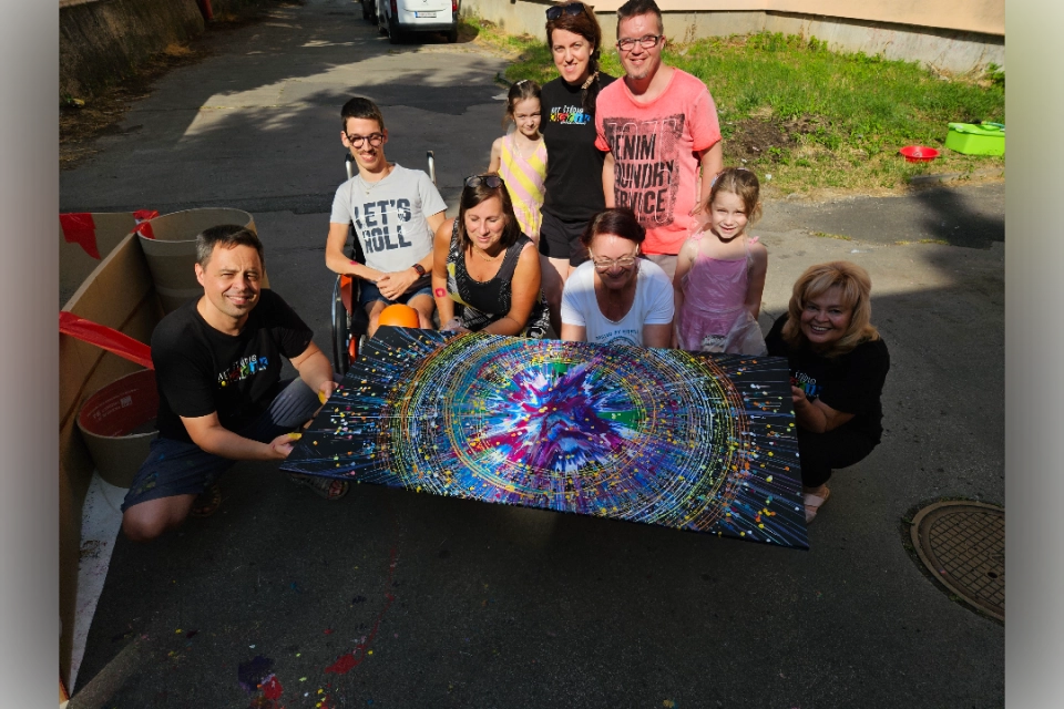 Dielo našich mám Ľubky, Regi, Ivetky a Janky. Štyri žienky spojili svoje sily a pustili sa do tvorenia. Práca im išla od ruky a na koniec sa na ten obraz nevedeli vynadívať. Obraz nám pripomína veľký tresk, nazvali sme ho „Začiatok“. Z jeho stredu sa šíri explózia farieb a pulzujúce kruhy. „Začiatok“, nie je len názov. Je to myšlienka, ktorá nás spája. Jediný bod. Jeden okamih. Jedna iskra, z ktorej sa môže zrodiť všetko – tvorba, život, zmena. Sledujeme špirály farieb, ako sa rozbiehajú do priestoru. Každá čiara je dôkazom, že z jedného môže vzniknúť nekonečné množstvo možností. Tento obraz nás pozýva stíšiť sa, zastaviť a pripomenúť si: Aj my všetci pochádzame z jedného. A hoci sme každý iný, stále patríme do jedného. Táto aukcia nie je len o obrazoch, je o nádeji, spolupatričnosti a sile spoločne tvoriť krásu. Zapojte sa aj vy. Pridajte farbu do života tam, kde ju najviac treba. Akryl na plátne, veľkosti 70x140cm. Ďakujeme! Pozrite si video a foto z art workshopu či vernisáže výstavy Roztočme farby Foto z art workshopu Roztočme farby – časť 1 https://okacik.sk/art-workshop-roztocme-farby/ Foto z art workshopu Roztočme farby 2025 – časť 2 https://okacik.sk/art-workshop-roztocme-farby-2-cast/ Video z celého projektu https://youtube.com/shorts/S7N2Dro9Pnc Foto z vernisáže výstavy https://okacik.sk/vernisaz-vystavy-roztocme-farby-2025/